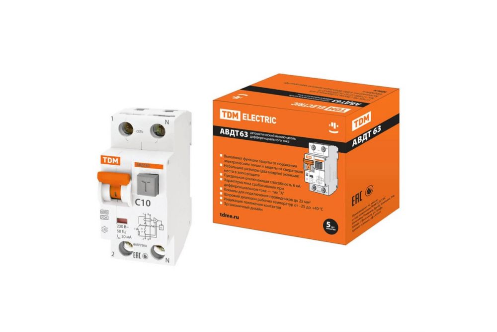 Корпус автоматического выключателя дифференциального тока TDM АВДТ 63 2Р выполнен из негорючего пластика