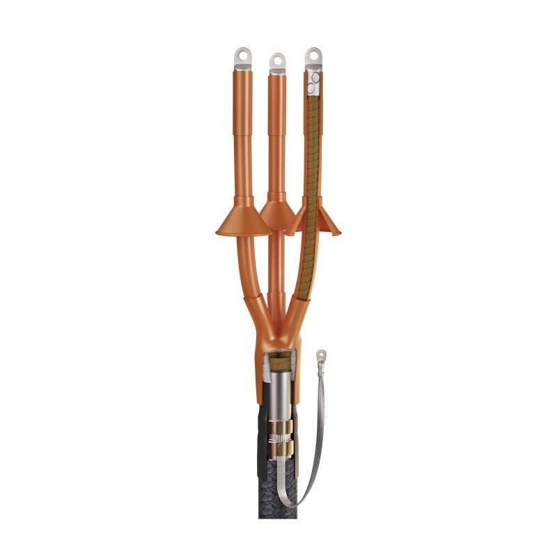 Муфты термоусаживаемые концевые внутренней и наружной установки на напряжение 6 и 10 кВ для 3-х жильных кабелей с бумажной маслопропитанной изоляцией Типы: 3КВТп-10 (для внутренней установки) 3КНТп-10 (для наружной установки) Предназначены для оконцевания 3-х жильных кабелей с бумажной маслопропитанной изоляцией, с броней или без брони, с общей алю- миниевой или свинцовой оболочкой на напряжение 6 и 10 кВ Типы монтируемых кабелей: ААБл, (А)СБл, (А)СБГ, ААГ, (А)СГ, ААБв, (А)СБШв, ААШв, (А)СШв, ААБ2лШв, (А)СБ2лШв Основные термоусаживаемые элементы муфты: перчатка, трубки жильной изоляции, концевые манжеты и жильные изоляторы выпол- нены из трекингостойкого материала кирпично-красного цвета.